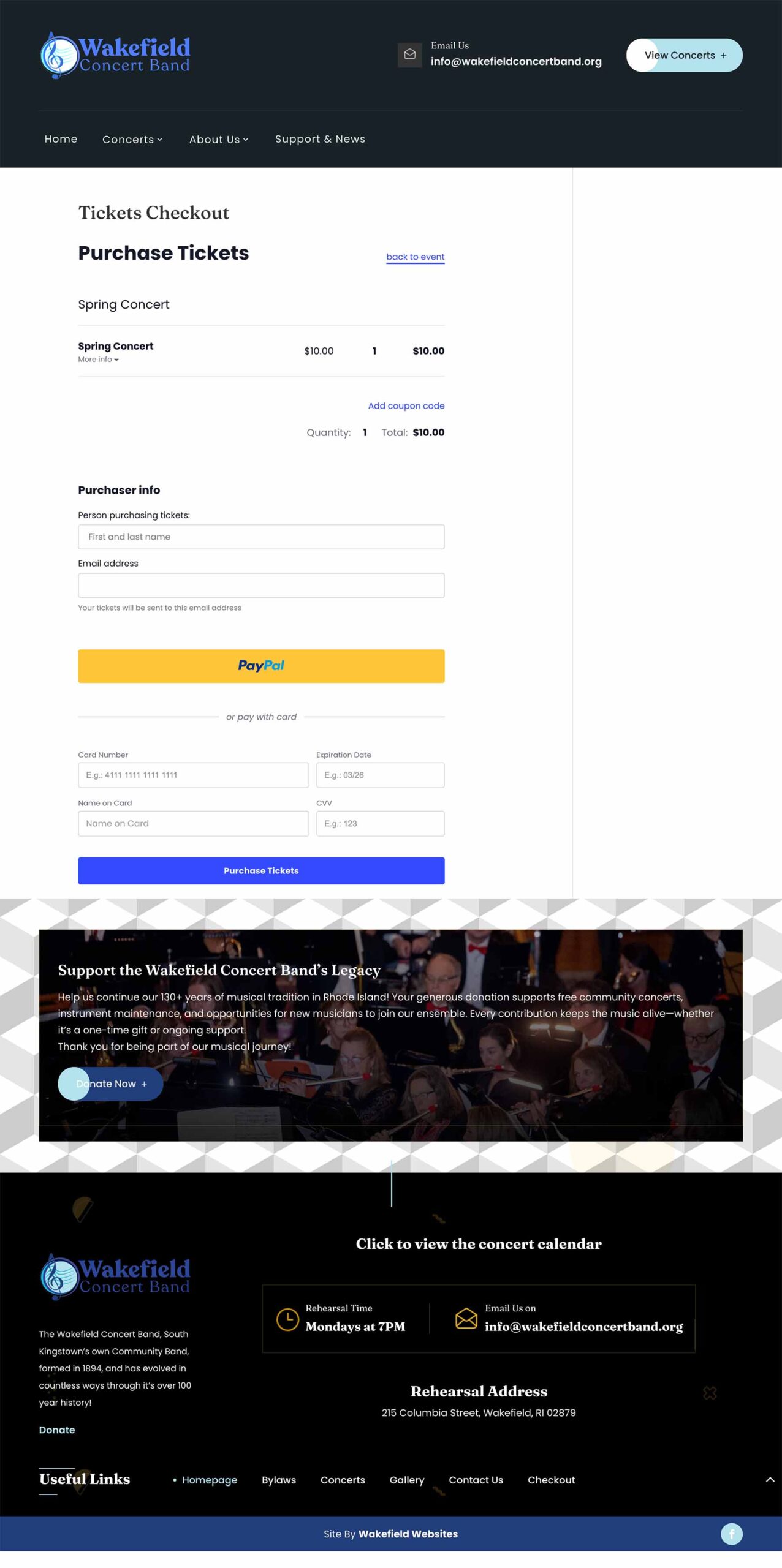 View Live Website: https://www.wakefieldconcertband.org/ Technologies: WordPress, The Events Calendar, PayPal integration, custom graphics/banners, responsive CSS/JavaScript.
